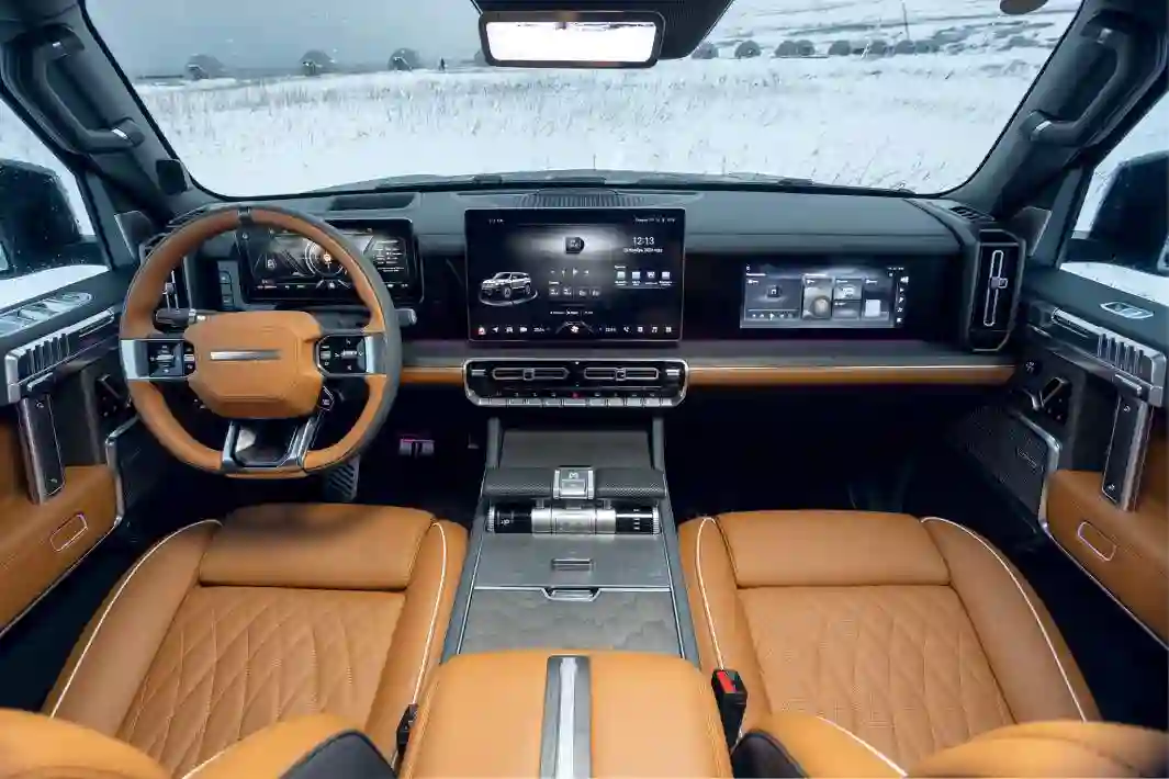Интерьер для китайского автомобиля избыточно роскошен: натуральная кожа наппа, шпон из ценных пород дерева, электрорегулировка руля. Удивляет разве что отсутствие подогрева рулевого колеса и доводчиков довольно тяжелых дверей, за исключением багажной. Всё здесь с перебором по размеру — массивные кресла с массажем, подогревом и множеством регулировок, «самолетные» селекторы на широченном центральном тоннеле, глубокие подстаканники. Посередине — большущий тачскрин плюс еще два дисплея по бокам от него. Механическое превалирует над сенсорным — управление возложено на крупные клавиши и колесики, кресла регулируются «по-мерседесовски» тумблерами в форме сидений. Очень стильное решение — индикация режимов движения механическим барабанчиком под прозрачным стеклом. При этом двери изнутри открываются кнопками, не связанными с замками.  Диван второго ряда делит пополам массивный откидной подлокотник с еще одним тачскрином — с его помощью можно независимо настроить части дивана, включить массаж. Можно изменить температуру климат-контроля, но тогда она поменяется и спереди, отдельной климатической зоны сзади нет. Печка, кстати, мощная, внутри тепло. Вся эта массивная мебель создает внутри немаленького автомобиля ощущение тесноты. Багажник и вовсе крохотный, хотя снабжен мощными петлями для крепления груза.