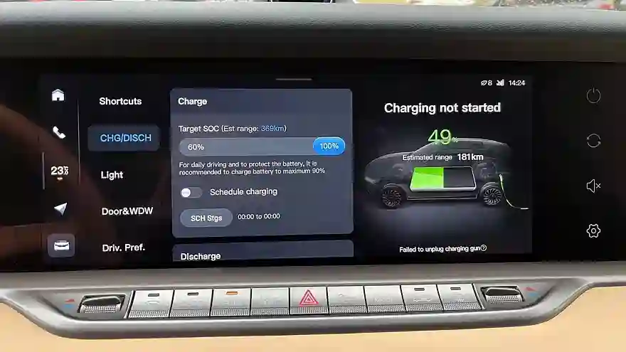 Free оснащен двумя наиболее распространенными разъёмами для заряда в России: CCS и Type-2. Если живете за городом, то на зарядку переменным током через разъём Type-2 (мощностью 11 кВт) в диапазоне от 5% до 100% уйдет 9,5 часов. На практике с питанием от обычной дачной розетки не задалось. Судя по дисплею, на входящем в комплектацию кабеле под бытовую сеть машина пыталась взять из нее 3,5 кВт. Проводка к такому оказалась не готова, и автомат выбивало каждые пятнадцать минут. Нужен кабель попроще, чтобы довольствовался стандартными 2-2,5 кВт.